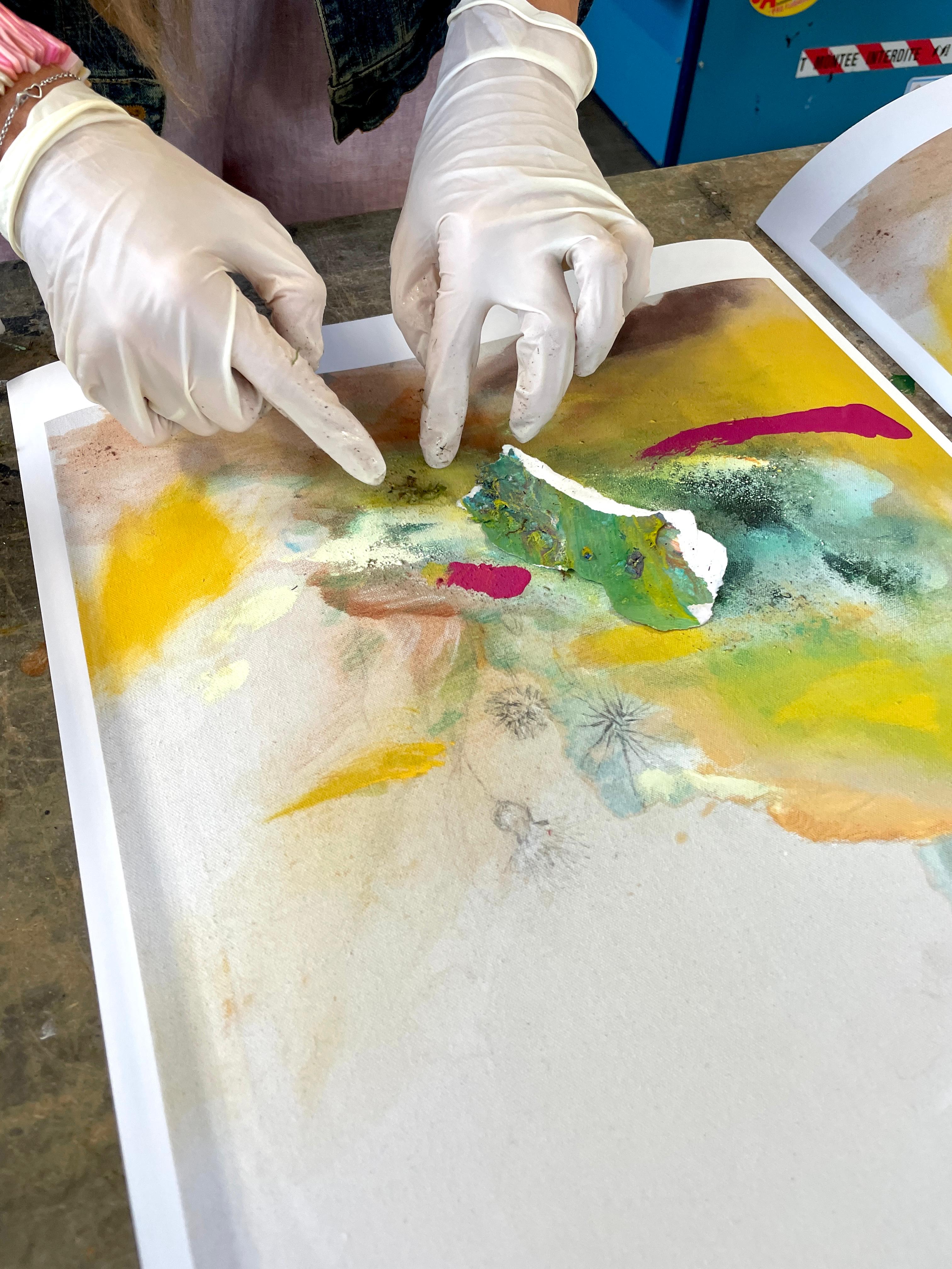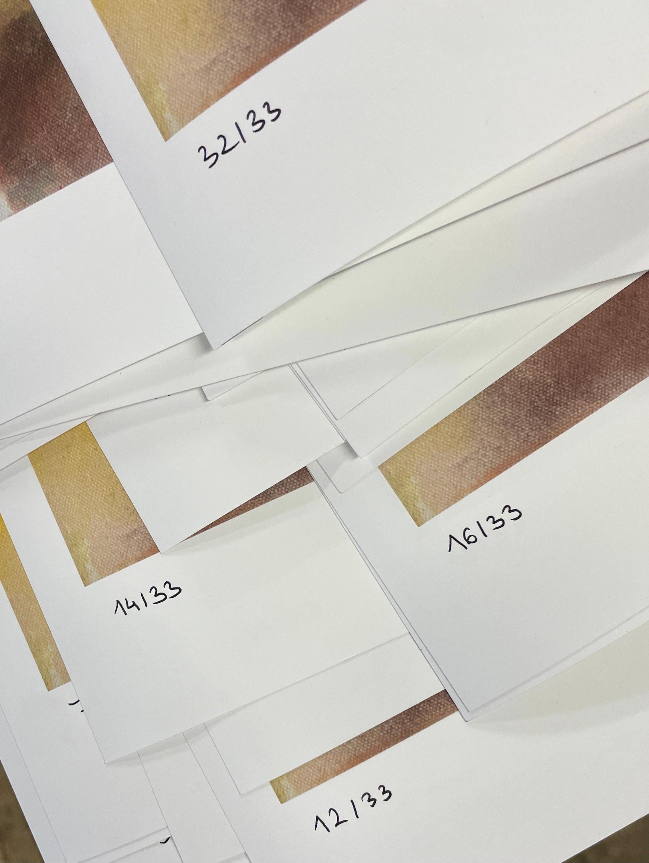 Jeder Druck ist von der Künstlerin collagenartig mit Teilen von Papierarbeiten, Moos und/oder Planzen verfeinert und damit ein Unikat. So bringt Daniela Prokopetz den Charme ihrer schichthaften, texturierten Originale in Printform.