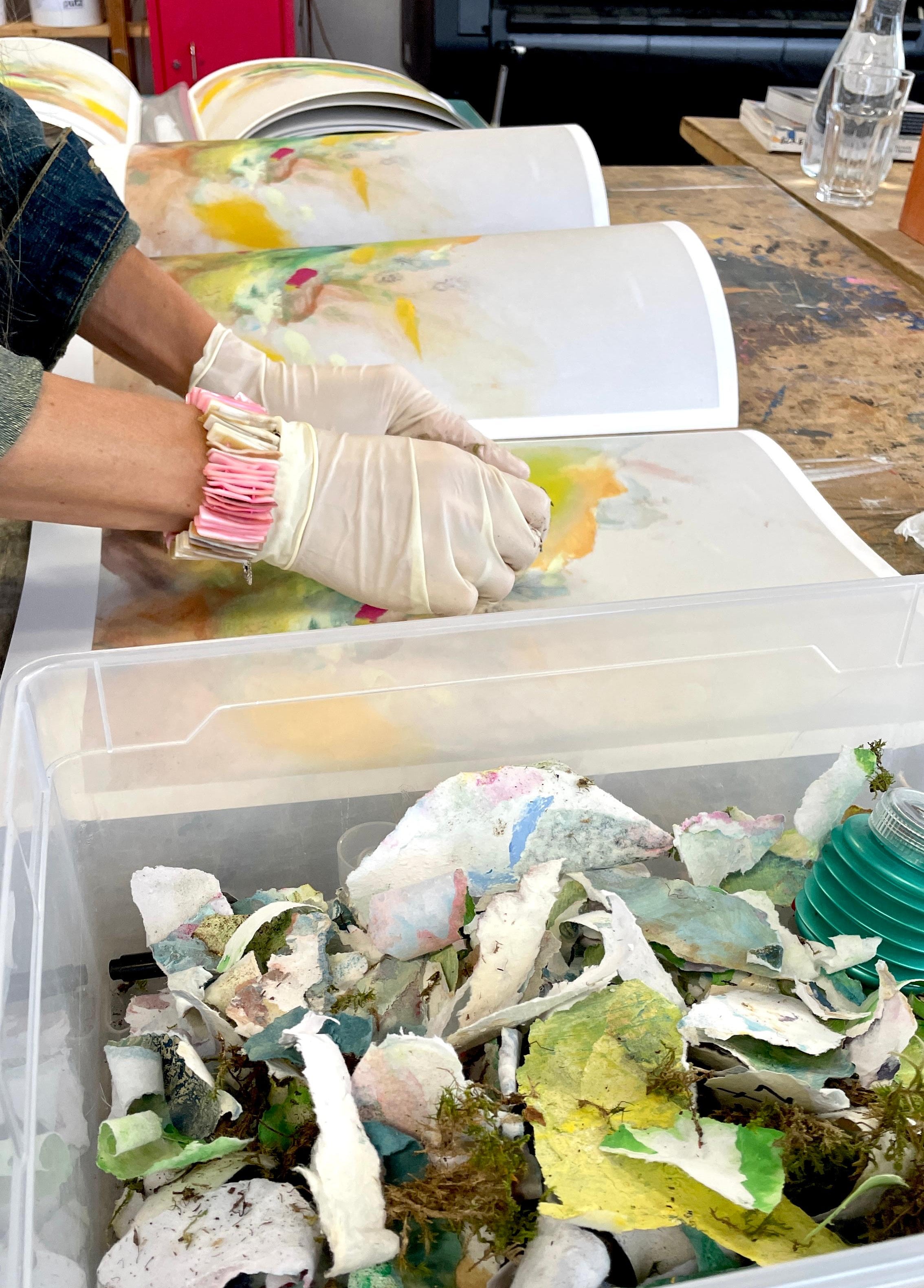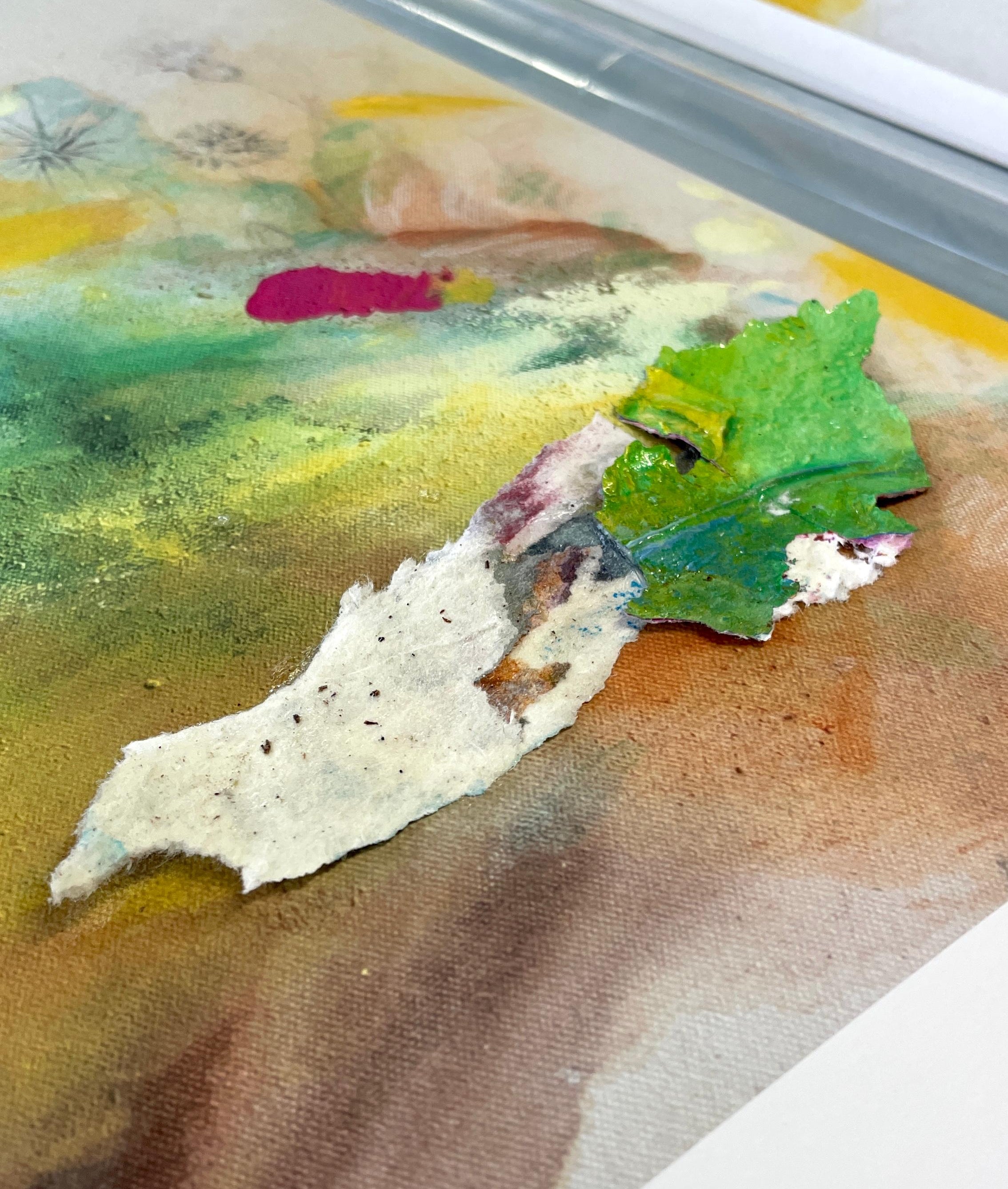 Daniela Prokopetz Inspirationen sind organische Formen und Zustände in der Natur. Ihre Werke erzählen von der Transformation von fließendem Wasser in gefrorene Formen und zartem Nebel. Von Moos und Flechten, die sich über Steine legen. Von wandernden Wolken und Sonnenstrahlen. Dem Kreislauf des Wachsens und Vergehens in der Natur. Im stressigen Alltag sehen wir die Feinheiten und Schönheiten der Natur nicht mehr. Mit ihren Werken möchte die Künstlerin zur Verbindung mit der Natur anregen und unser Bewusstsein für die Schönheiten des Alltags sensibilisieren. Sie bindet organische Pigmente in ihre Arbeiten ein und verwendet überschüssiges Papiermaterial für Objekte und Malereien, als würde sie den Kreislauf der Natur nachempfinden. Die Künstlerin schafft mit ihren schichthaften und texturierten, landschaftsartigen Kompositionen eine erzählerische Lebendigkeit und Leichtigkeit, die geheimnisvolle und poetisch anmutende Welten entstehen lässt.