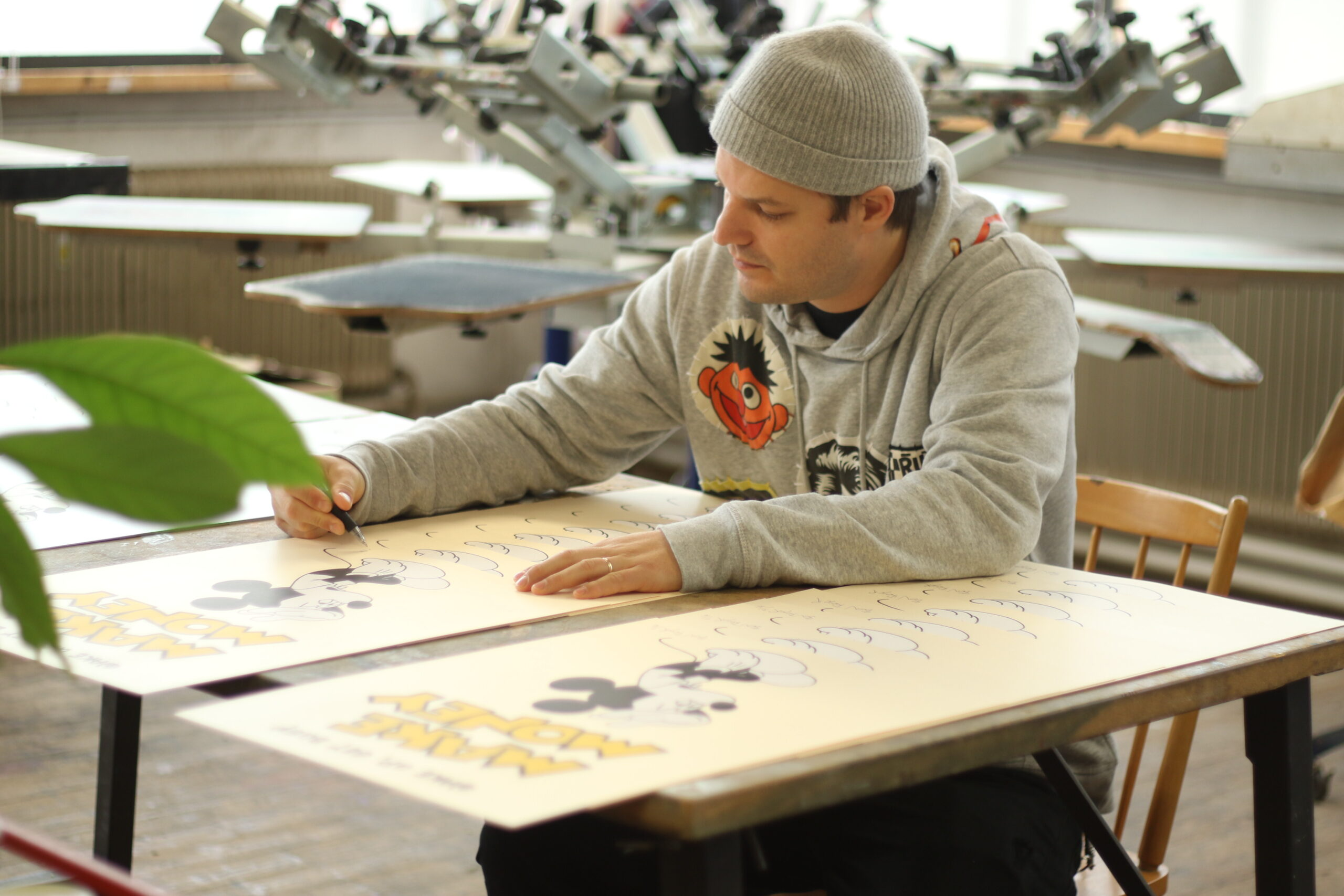 Der Künstler Ben Reyer ist vor allem für seine gesellschaftskritischen Collagen bekannt, welche mit Ausschnitten aus westlichen Populär-, Werbe- und Druckmedien gespickt sind. So kann schon mal ein Engel eine Zigarette umarmen oder der Marlboro Man zu MC Donalds dinieren gehen. Meist ist seine Arbeit mit einer tüchtigen Portion Humor unterfüttert um nicht zu letzt den Genuss von Kritik zu erleichtern. Nicht anders verhält es sich bei seinen Entlehnungen bekannter Logo-Varianten. Die in rot-weiss gehaltene „Kranke Zeiten“ Grafik ist eine geremixte, in neue kontextuale Bedeutungsebenen gehobe Appropriation auf die wieder und wieder kopierte Stilistik der Logos vorherrschender Nachrichtenmedien – Die grafische Ästhetik kann man sich leicht beim Life Magazin oder der deutschen Bild Zeitung in Erinnerung rufen.