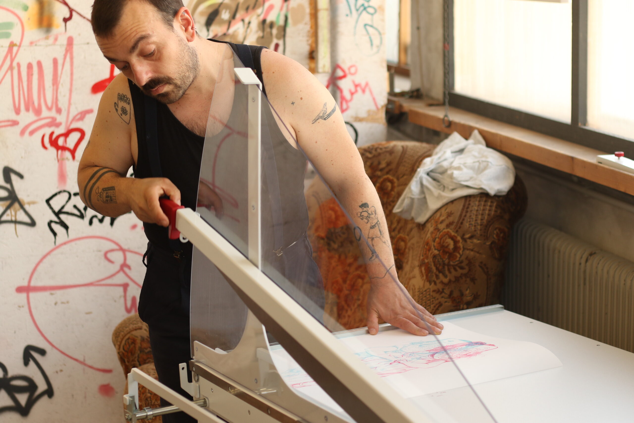 1985 in Stuttgart, Deutschland, geboren Lebt und arbeitet seit 2009 in Wien Teil des berüchtigten „Studio Walls“ seit 2017 Als Multimedia-Künstler lässt er sich von verschiedenen Erfahrungsbereichen inspirieren. In seiner Arbeit als Bühnenbildner konzentriert er sich auf Komposition und Farbe. Als gelernter Tischler und ehemaliger Probebühne-Koordinator am Volkstheater Wien verbindet er die technische Machbarkeit mit künstlerischen Komponenten der schönen Künste. Sein Hauptaugenmerk liegt auf einem konzeptuellen Ansatz. In seinem Werk gibt der Künstler ein klares Statement zu Fragen, die sich beim Betrachter zu aktuellen und teilweise zeitlosen Themen ergeben. Zu seinem Themenbereich gehören soziale Gerechtigkeit, die Gleichstellung der Geschlechter und der Abbau von Vorurteilen. Im Moment konzentriert er sich auf die Idee der Wiederholung in allen ihren Formen.