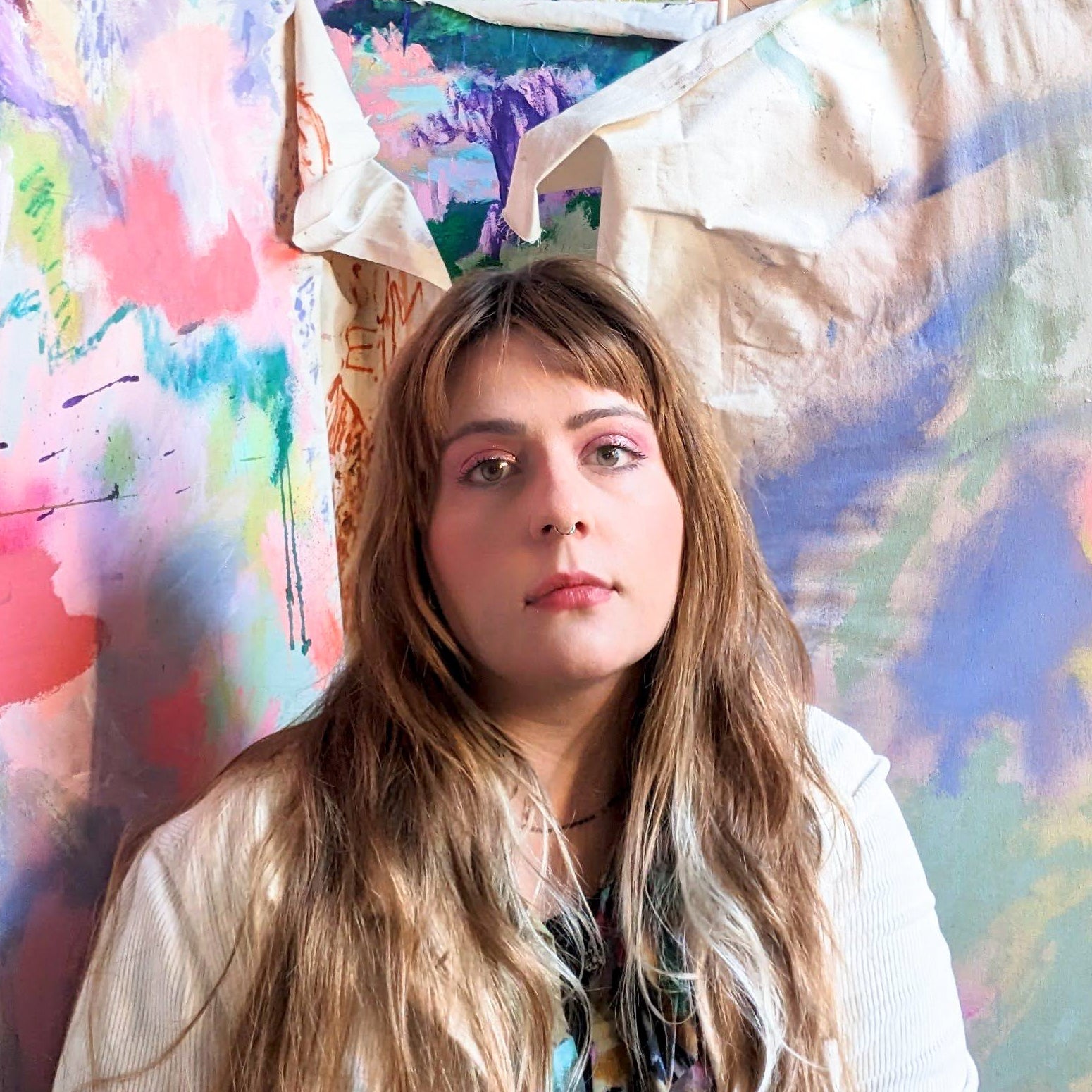 Anna Pelz (1997, Wien) studiert seit 2018 in der Abteilung TransArts an der Universität für Angewandte Kunst in Wien, seit 2022 im Master, und experimentiert mit unterschiedlichen Medien wie Skulptur, Fotografie und Text, während ihr Fokus auf der Malerei liegt und wie sie diese installativ in den Raum erweitern kann. Sie spielt mit sinnlichen Materialien und leuchtenden Farben als niederschwelliger Zugang zur Kunst und komplexen Thematiken. Ihre Arbeitsweise lässt sich als intuitiv beschreiben, während Recherchen zu aktuellen Themenbereichen stets Einfluss auf ihr Schaffen haben. Anna Pelz lässt ihre inneren Welten mit dem Äußeren verschmelzen und verschränkt persönliche Emotionen mit dem Weltgeschehen. Sie hinterfragt gängige Kategorisierungen und vermeintliche Gegensätze und lässt diese koexistieren. Die Künstlerin stellt seit 2019 solo und bei Gruppenausstellungen (ParallelVienna 2019-2023, AUSBRUCH – LesNouveauxRichesMagazin @ImproperWallsGallery,…) aus und nahm 2020 bei einer Residency der St.MoritzArtAcademy teil.