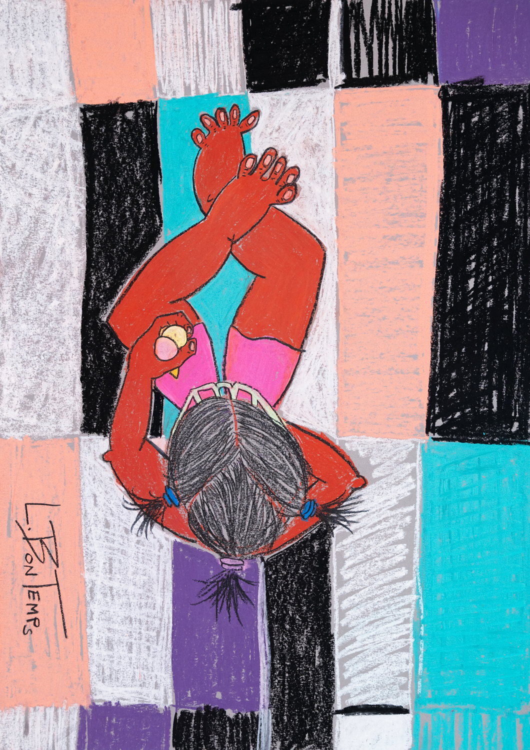 Die Malereien von Léonce sind von einem hohen Grad an Freiheit geprägt, ob er nun seine Kindheitserinnerungen, menschliche oder tierische Silhouetten, Stadtszenen oder auch Skizzen von Organen zu Papier bringt. Er lässt sich von Träumen, von Menschen, die er auf der Straße sieht und von Fremden im Internet inspirieren. Er konzentriert sich auf die Harmonie von Farben, Kontrasten und Texturen, so dass die Motive sich abheben und durch das systematische Zeichnen von Konturen zum Leben erwachen.
