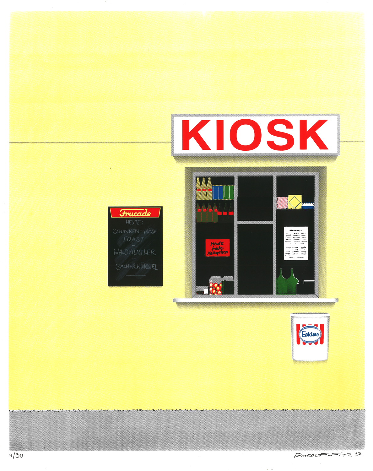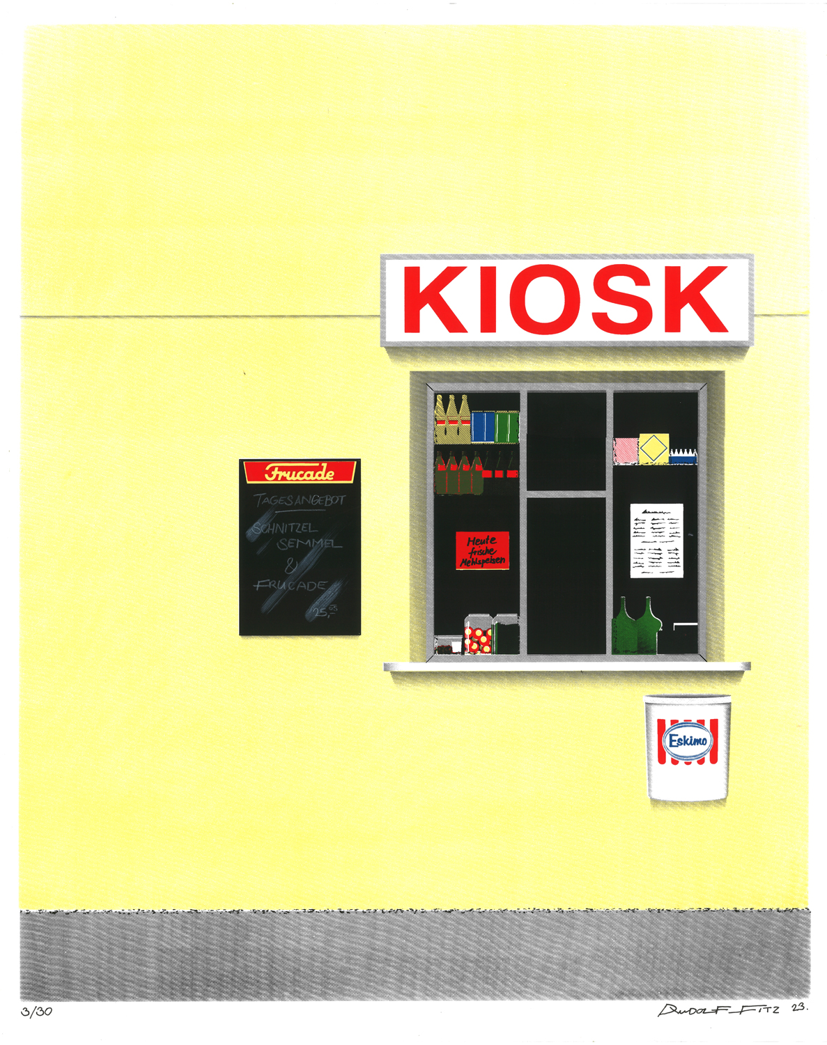 Rudolf Fitz, geb. 1989, lebt und arbeitet als freischaffender Künstler in Wien Fitz schafft in seinen Werken fiktive Realitäten, welche sich in alten Geschäftslokalen, Schriftzügen und verloren gegangenen Elementen der Straßen widerspiegeln. Die BetrachterInnen lässt er in eine andere Zeit eintauchen, weckt deren Kindheitserinnerungen und Sehnsüchte. Einen Bezug zu seiner Heimat Wien ist oftmals zu finden, vielseitige Inspirationen aus aller Welt und die fiktive Ausarbeitung, setzt dieses jedoch nicht voraus. Der Würstelstand prägt das wiener Stadtbild, verbindet jede Gesellschaftsschicht, ist ein nicht wegzudenkendes Paradies für Nachtschwärmer, Promill-Philosophen und verlorene Seelen. Ein Motiv welches Fitz gerne zitiert, ein Sujet, das viel von dem widerspiegelt, was den Charme der Stadt ausmacht. Sein Fokus liegt auf Ölmalerei, neben klein- & großformatigen Leinwandarbeiten entstehen auch Werke auf Papier. Zusätzlich erscheinen in regelmäßigen Abständen Siebdrucke & Fineartprints in limitierten Auflagen. Werke von Fitz wurden bereits in zahlreichen Ausstellungen, Messen und Charity Auktionen, national und international, gezeigt.